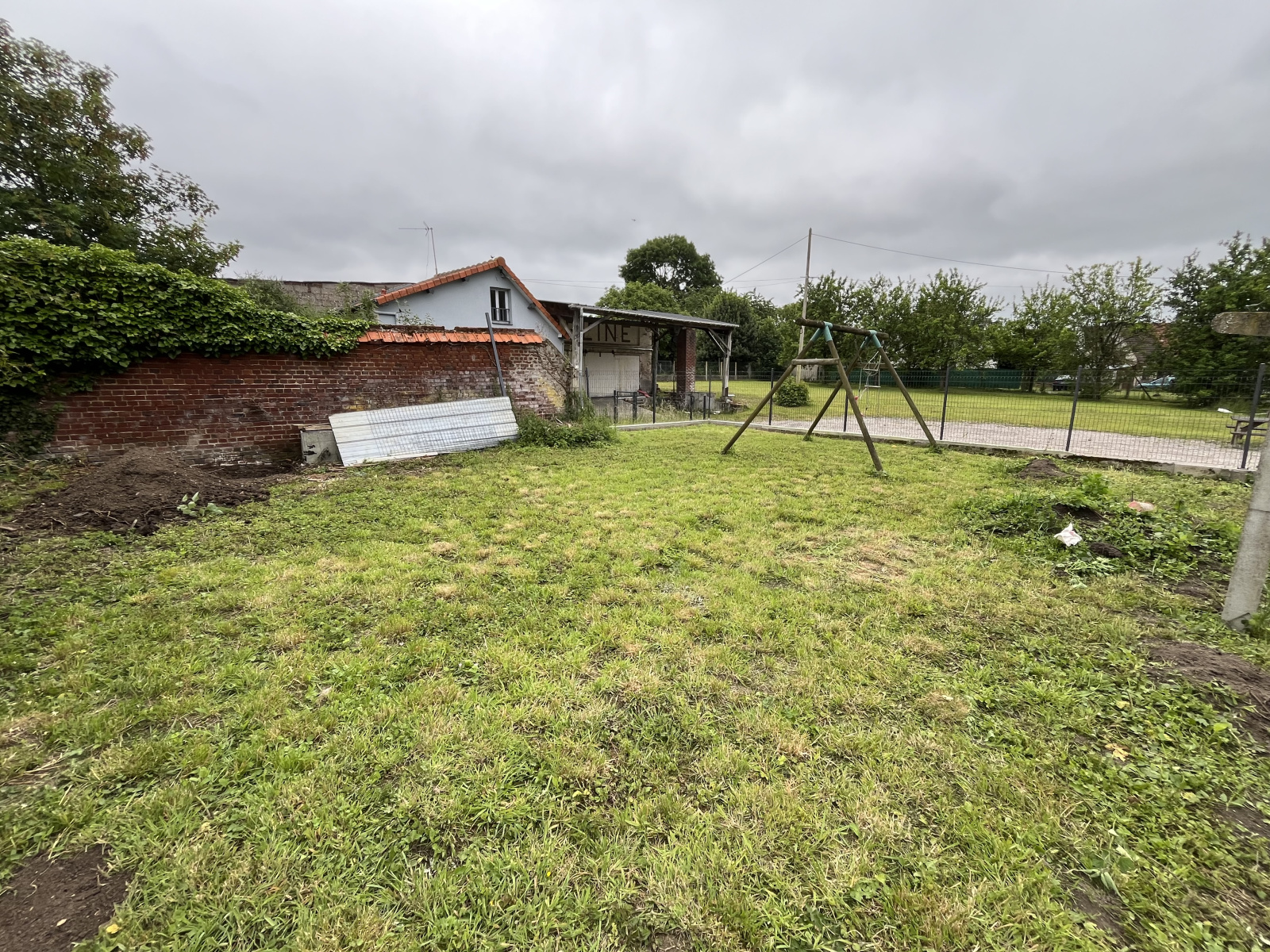 à l'extérieur : une cour avec une place de parking, plus dépendance, et un terrain en gazon pour les enfants.